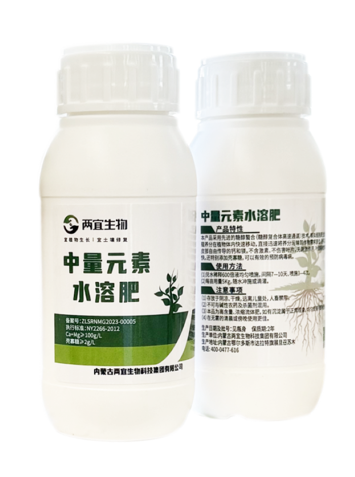 两宜中量元素水溶肥富含钙、镁等作物生长所需的重要中微量元素。采用先进的糖醇螯合(糖醇复合体高速通道)技术,模拟细胞原生质汁液,运载养分在植物体内快速移动,将养分运输到作物需求部位。含有可以在植物韧皮部自由传导的钙和镁。不含激素,不伤害叶片,无刺激作用,叶面吸收效率高,速度快。其中还特别添加壳寡糖,可以有效的预防病毒病。